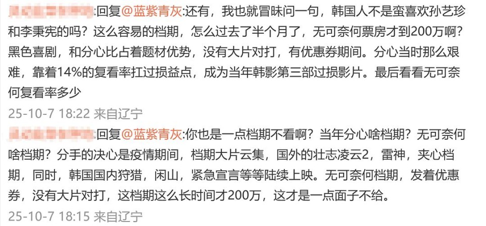 “玄彬的粉丝那么多,评分依然掉到5.2分,可见粉丝多是没什么用的……韩国观众也不太认可,如果认,票房不会是491万人次,而是941万人次才对,搞到最后离损益点500万人次尚差那么一线的距离,韩国观众太不争气了。”